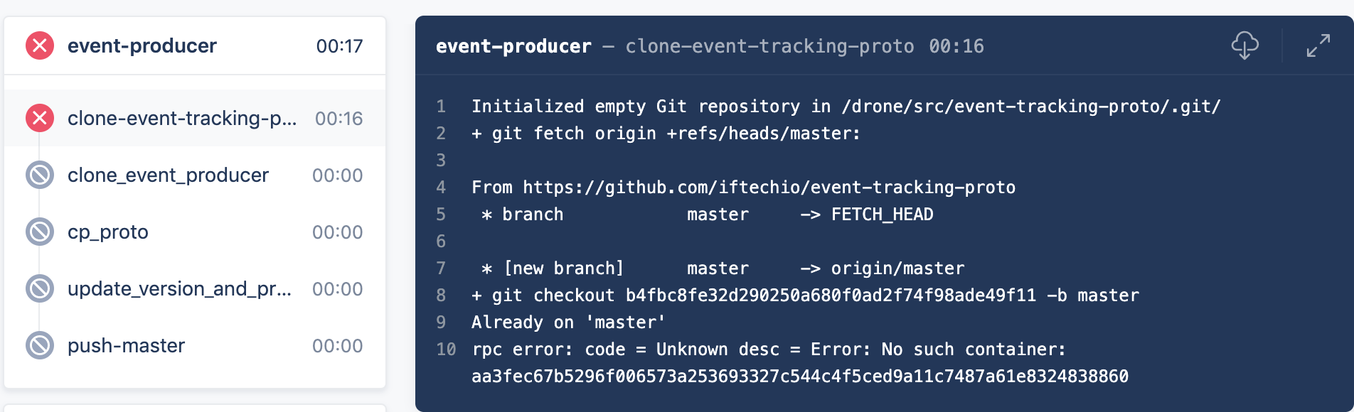 于是我开始怀疑是不是 git checkout -b master 时出现了错误,于是我在 Docker 容器中模拟了该 Step 的步骤,git checkout -b master | echo $?,发现即使是显示 Already on master 它的退出码也是 0。于是排除了是 git 出错的可能性。
