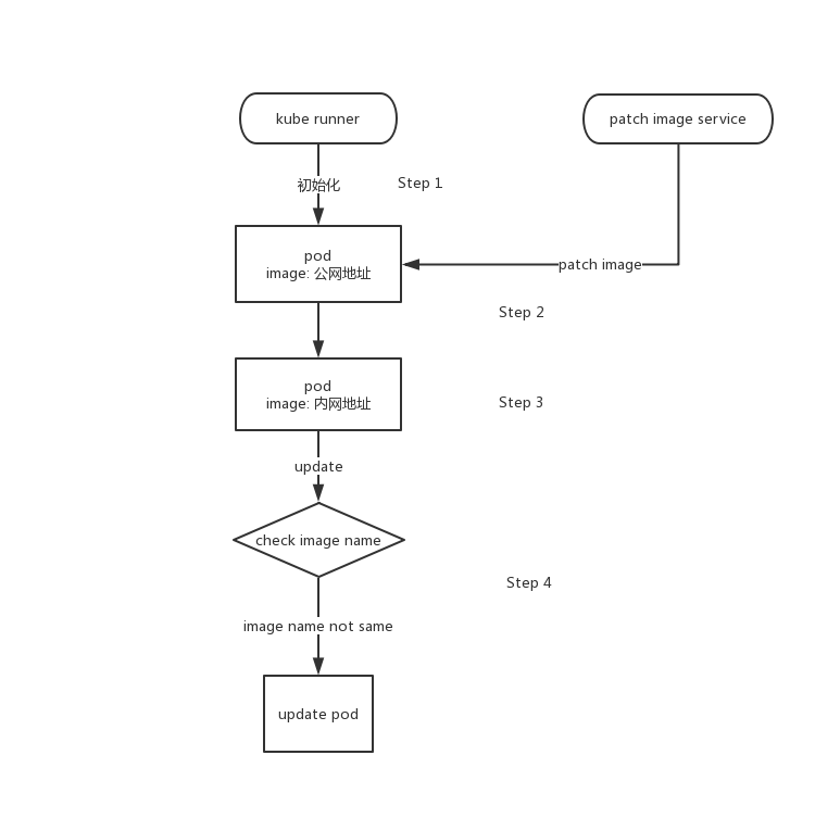 在 runner 创建 pod 时,先将 image 设为了公网地址(Step 1),接着 image 被另一个服务设置成了内网地址,并提交到 k8s 中运行了。然后 runner 通过对比发现 pod 的 image 不是自己刚开始设置的 image,于是就 update 了这个 pod(Step 4)。